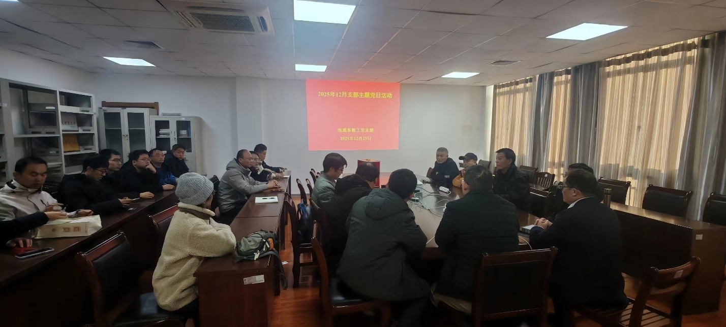会议分为两个阶段进行。会议第一阶段,支部开展12月主题党日活动,本月支部活动主题是“持续深入学习宣传贯彻党的二十届四中全会精神”。首先,全体党员面向党旗庄严宣誓,重温入党誓词。随后,支部书记罗进雄带领大家学习了习近平总书记系列重要讲话和重要指示批示精神,涵盖依法治国、党的自我革命、网络生态治理、高标准建设海南自由贸易港等重要内容,同时传达学习了湖北省委十二届十一次全体会议精神以及学校关于“双一流”建设的相关部署,并开展了涉黄、涉赌、酒驾等违法警示教育。最后,地质系主任李涛就2025年地质系各项工作情况进行了通报,指出了地质系目前发展中存在的问题,提出全体党员同志要以奋勇争先的态度,努力拼搏,为2026年学校冲击“双一流”建设贡献力量。