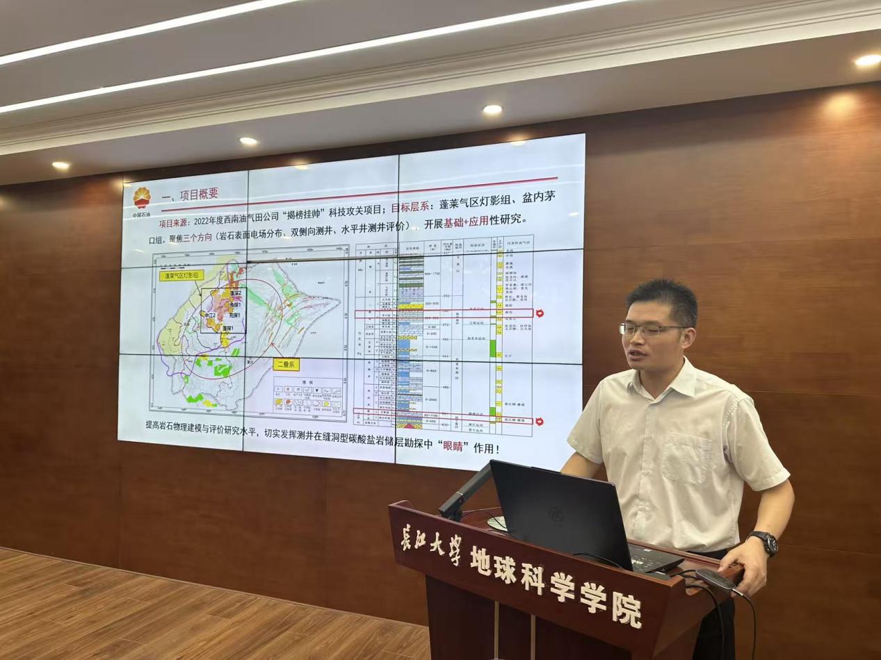 随后,地球物理学院唐军教授与许巍副教授共同汇报了“四川盆地复杂储层声电测井响应机理及配套软件开发”的专题汇报。