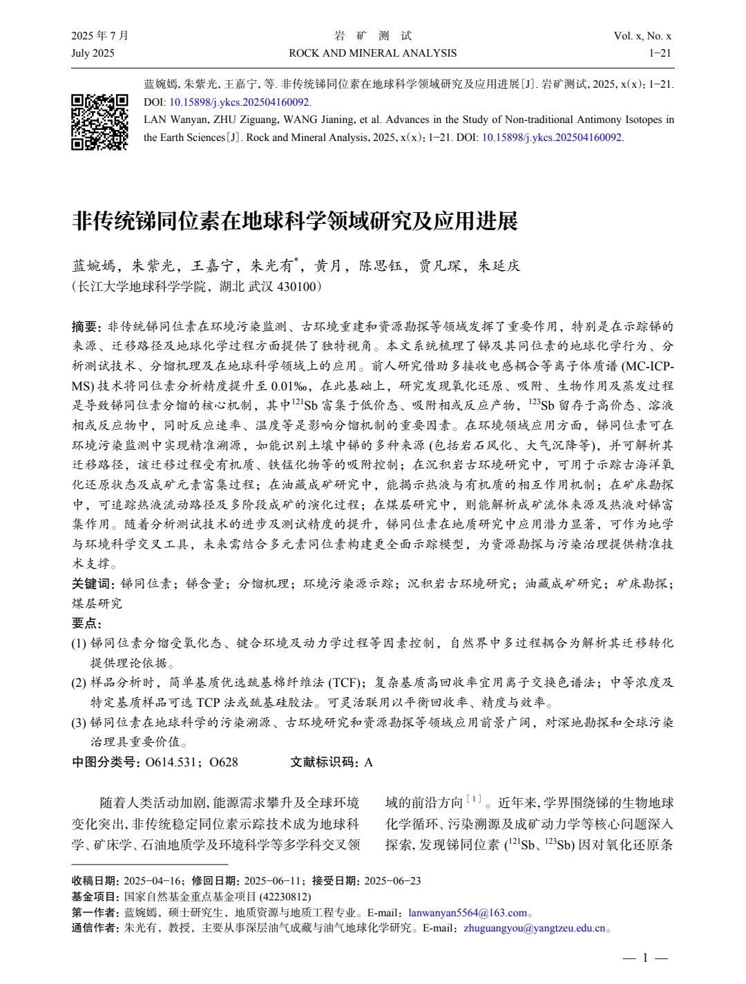(通讯员 贾凡琛)近日,伟德国际1949官网21级本科生蓝婉嫣在核心期刊《岩矿测试》发表题为《非传统锑同位素在地球科学领域研究及应用进展》的论文(全文共21页)。论文作者均为伟德国际1949官网师生,其中地质资源专业22102班本科生蓝婉嫣为第一作者,其导师朱光有教授为通讯作者。该论文系统梳理了锑及其同位素的地球化学行为、分析测试技术、分馏机理,以及在地球科学领域的应用。
