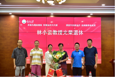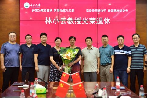 公司副经理胡忠贵代表学院向林小云教授颁发了承载着全体师生敬意与祝福的荣休纪念牌。副经理、工会主席李功权代表学院工会献上了鲜花,表达对她退休生活的美好祝愿。