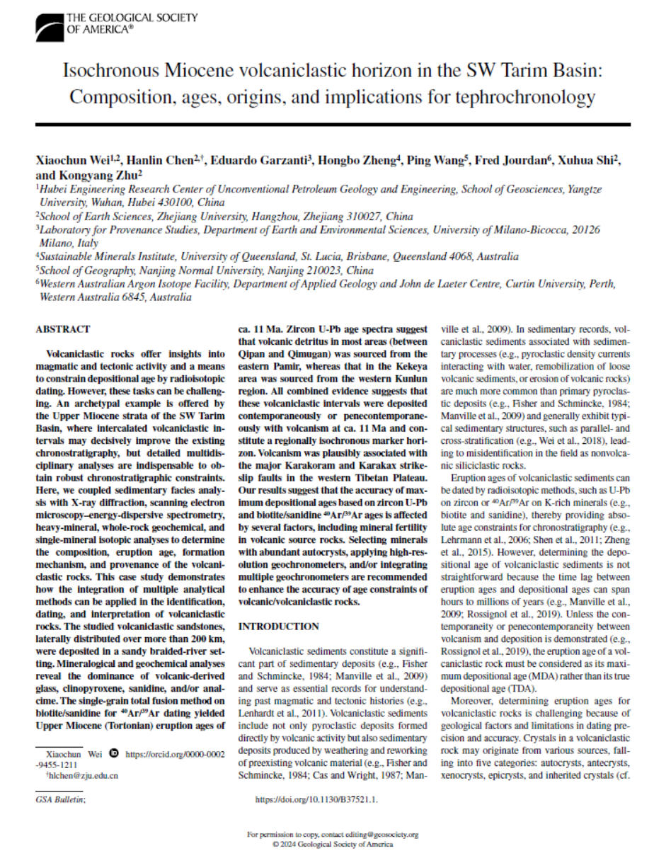 (通讯员 洪静文)近日,伟德国际1949官网石油系特任副教授魏晓椿在地学综合期刊《GSABulletin》上发表题为“Isochronous Miocene volcaniclastic horizon in the SW Tarim Basin: Composition, ages, origins, and implications for tephrochronology”的研究论文(图1)。在塔里木盆地西南缘(塔西南)识别出距今约1100万年的大规模等时火山碎屑沉积层,为破解该区域新生界缺乏可靠年代框架的难题奠定了重要基础。伟德国际1949官网“非常规油气地质与工程湖北省工程研究中心"为论文第一署名单位。