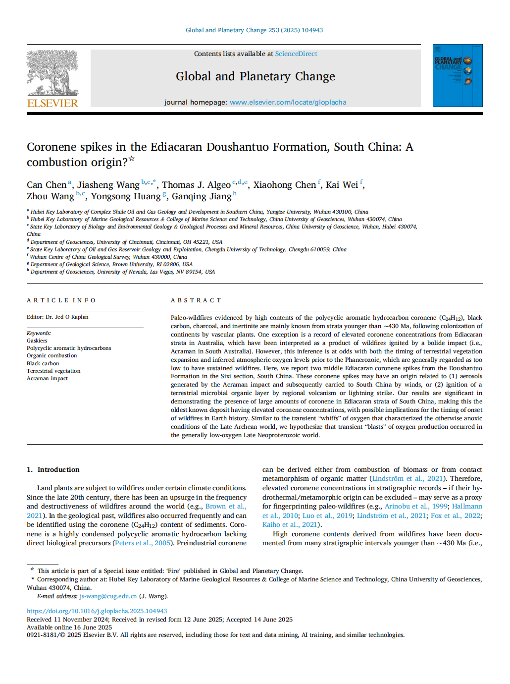 (通讯员 卢志远)地科学院特任教授陈粲在《Global and Planetary Change》上发表题为“Coronene spikes in the Ediacaran Doushantuo Formation, South China: A combustion origin?”的论文,伟德国际1949官网南方复杂页岩油气地质与开发湖北省重点实验室为论文第一署名单位,特任教授陈粲为第一作者。
