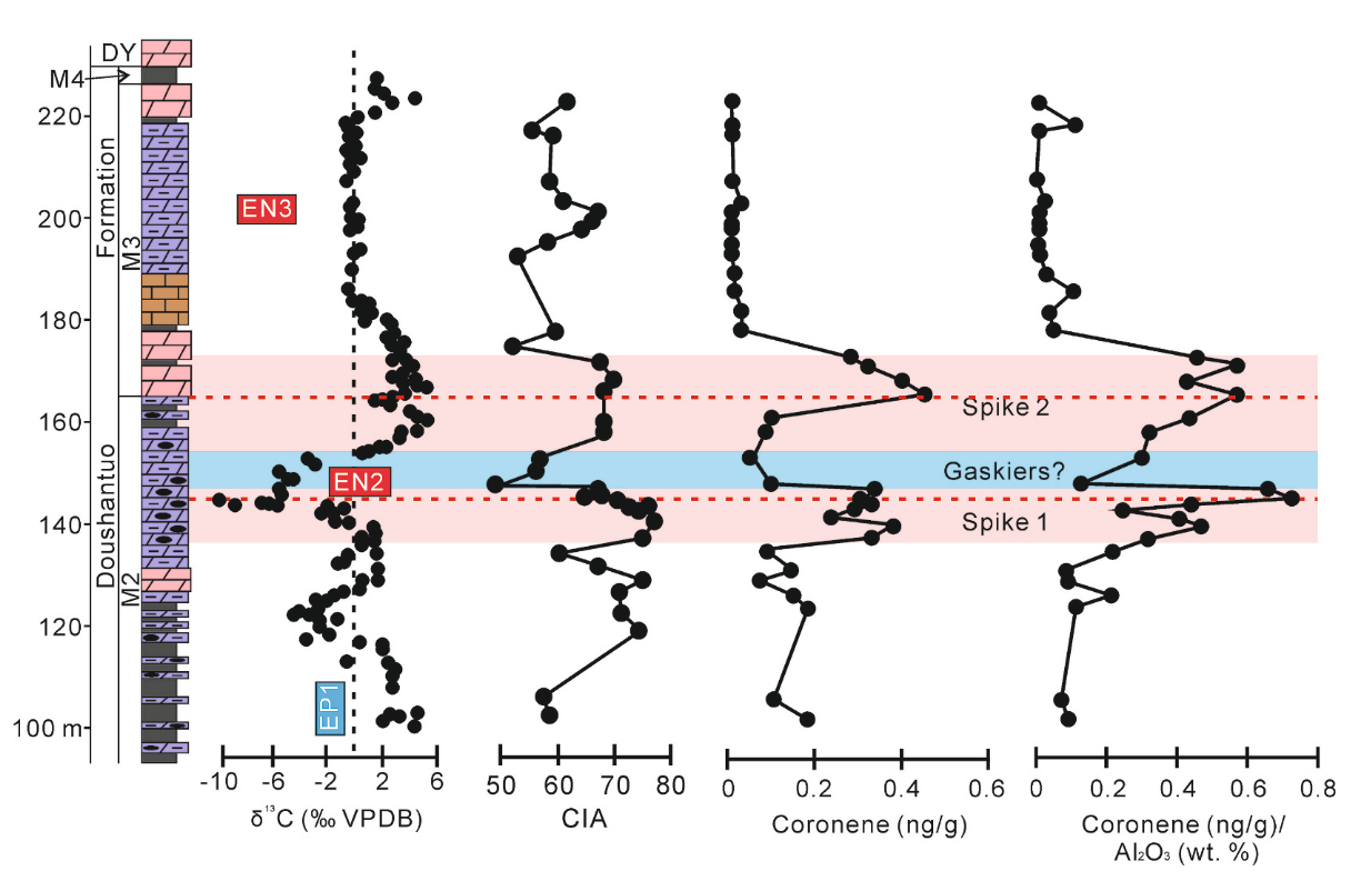 图1 华南泗溪剖面中-上陡山沱组碳同位素、化学蚀变指数 (CIA) 和晕苯浓度变化。蓝色区域代表低CIA值指示的寒冷期,该期可能对应于Gaskiers Glaciation冰期。晕苯/Al₂O₃峰值1和2显示为粉色区域。每个峰值对应 EN2 δ¹³C 值波动(红色虚线)。