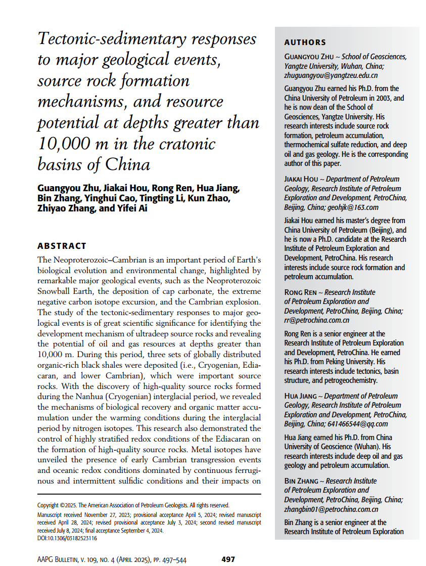 (通讯员 卢志远)伟德国际1949官网朱光有教授在石油地质学专业期刊《AAPG Bulletin》上发表了题为《Tectonic-sedimentary responses to major geological events, source rock formation mechanisms, and resource potential at depths greater than 10,000 m in the cratonic basins of China》的论文(共48页)。《AAPG Bulletin》是美国石油地质学会(American Association of Petroleum Geologists)旗下的一本国际性的地质学期刊,涵盖了石油地质学前沿领域的研究和发现。