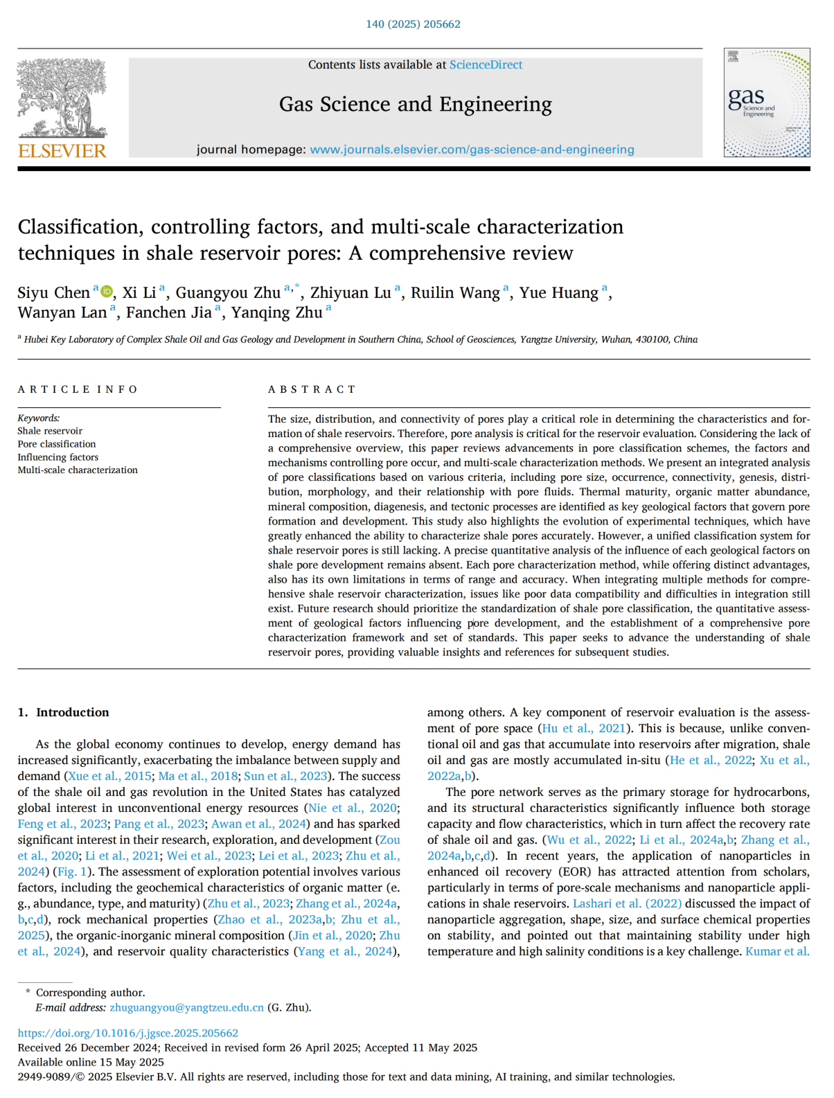 (通讯员 黄月)近日,伟德国际1949官网21级本科生(现在读大四)陈思钰在《Gas Science and Engineering》(GSE,原名Journal of Natural Gas Science and Engineering,天然气科学与工程,最新影响因子为5.285,位列JCR分区一区,中科院期刊分区工程技术大类二区)上发表了题为《Classification, Controlling Factors, and Multi-Scale Characterization Techniques in Shale Reservoir Pores: A Comprehensive Review》的论文(共18页)。全部作者均来自伟德国际1949官网,本科生陈思钰为论文第一作者,其导师朱光有教授为通讯作者。该论文分析了页岩储层孔隙的分类、控制因素及多尺度表征方法,为页岩储层孔隙进一步研究以及优化勘探开发策略、提高油气采收率提供了参考。