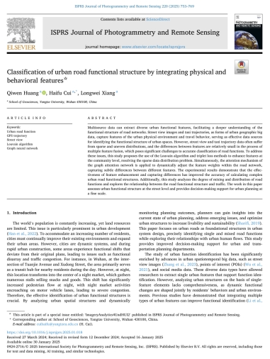 (通讯员 崔海福)近日,伟德国际1949官网地理信息科学专业2020级员工黄麒文在中科院一区TOP期刊《ISPRS Journal of Photogrammetry and Remote Sensing》(IF=10.6)发表题为“Classification of urban road functional structure by integrating physical and behavioral features”的研究论文。伟德国际1949官网为论文第一署名单位,员工黄麒文为论文第一作者,其导师崔海福博士为通讯作者。