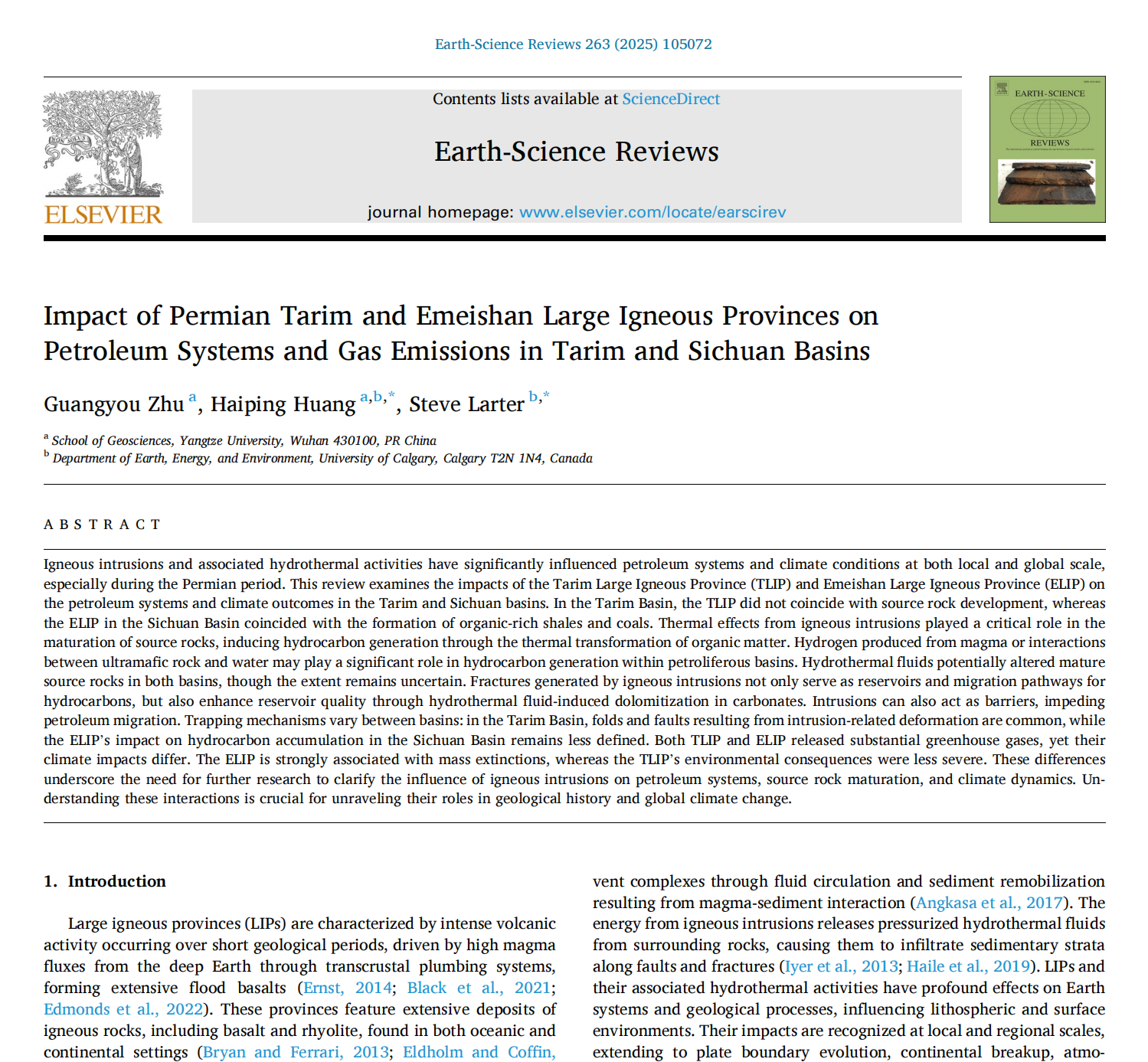 (通讯员:卢志远)近日,伟德国际1949官网朱光有和黄海平教授在中科院一区TOP期刊《Earth-Science Reviews》(IF=10.8)发表题为“Impact of Permian Tarim and Emeishan Large Igneous Provinces on Petroleum Systems and Gas Emissions in Tarim and Sichuan Basins”的论文。