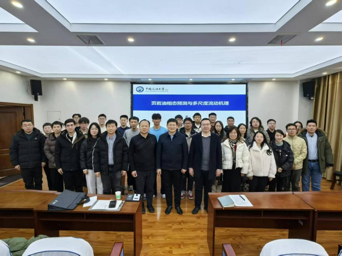 报告会上,王森教授深入阐述了页岩油相态的独特性质,从微观角度分析了不同压力、孔隙条件下页岩油的流动规律,通过大量实验数据和前沿研究成果,让师生们对页岩油有了更直观、深入的理解。在多尺度流动机理方面,王森教授通过"分子-孔隙-缝网"三级尺度的递进式分析,揭示了页岩油赋存状态与流动规律的内在关联,详细讲解了页岩微纳米孔隙-裂隙系统内多相流动特性,以及多尺度下流体流动的相互作用和影响因素。