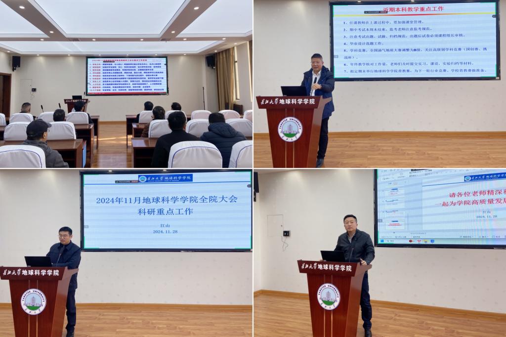 经理朱光有从员工工作、硕博培养、教学成果、学科调整、团队建设、科普宣传、青年人才、人才引进、国家专项、学校“六个倍增”计划10个方面进行详细地安排。针对近期开展的员工工作情况,他希望老师们能做好本职工作,以员工为中心,付出心血培养,加强对员工指导、关心、负责任地培养,加大研究生补助,宣传招生。他强调了学院在学科调整和团队建设相关工作等方面的现状,重点对地质学、地质资源与地质工程团队建设相关工作进行了部署安排。朱光有要求全院教师做好科研公共服务和科普工作,要求全院教师给予青年人才更多的关心和支持,青年人才也应积极融入大团队,参与学院工作;强调要牢牢把握学校引才政策的黄金窗口期,做到全员引才、针对性引才;要求相关教师加快对接国家专项相关工作,积极准备2025年国自然基金申报;对年底论文、科研经费、奖励、学术交流考核等相关工作进行了通报和部署安排。朱光有经理强调,目前学校正处于一流团队建设的关键时期,全院教师要齐心协力,为学校一流团队建设贡献出自己的力量。