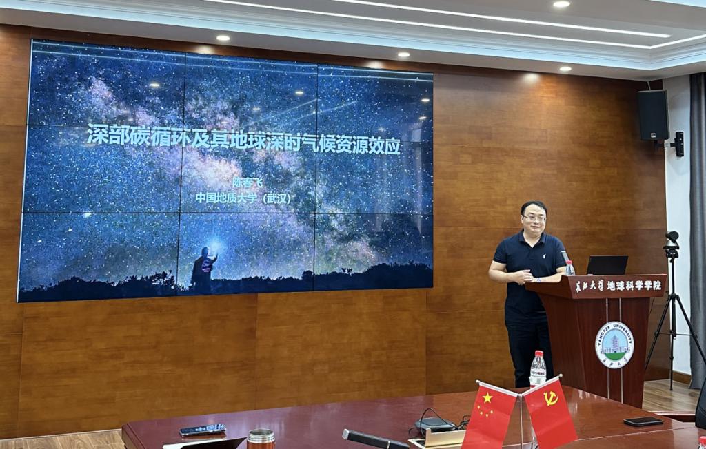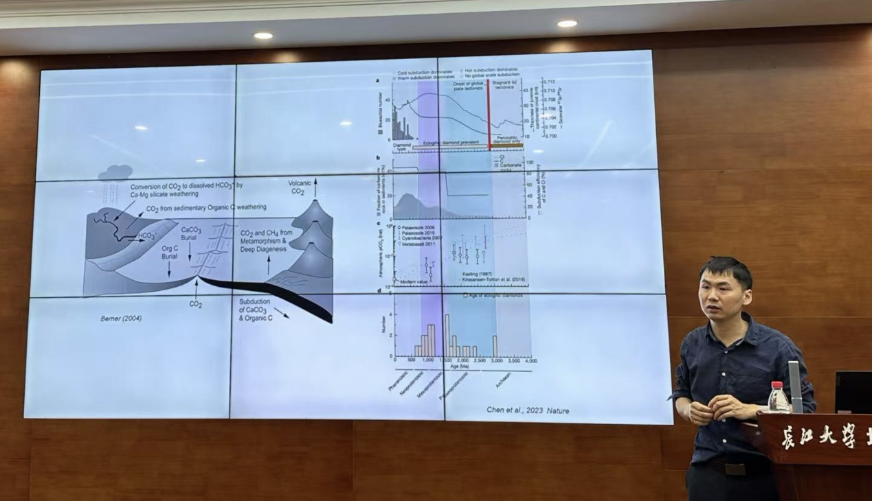 随后,陈春飞教授围绕深部挥发份循环及其地球深时气候资源效应这一主题,详细介绍了地质历史时期深部碳循环的天然岩石记录,高温高压实验对地球表生碳进入地球内部后的物理化学状态模拟结果,以及深部碳循环对表生环境的影响和宜居地球的塑造等目前国际上最新的研究进展。报告最后,陈春飞教授还分享了自己的科学研究心路历程,以他第一篇Geology,第一篇Nature Communications以及第一篇Nature论文的坎坷经历为例,鼓励年轻学者要独立创新,不怕挫折和失败,尊重实验数据,坚持真理,勇攀科研高峰。