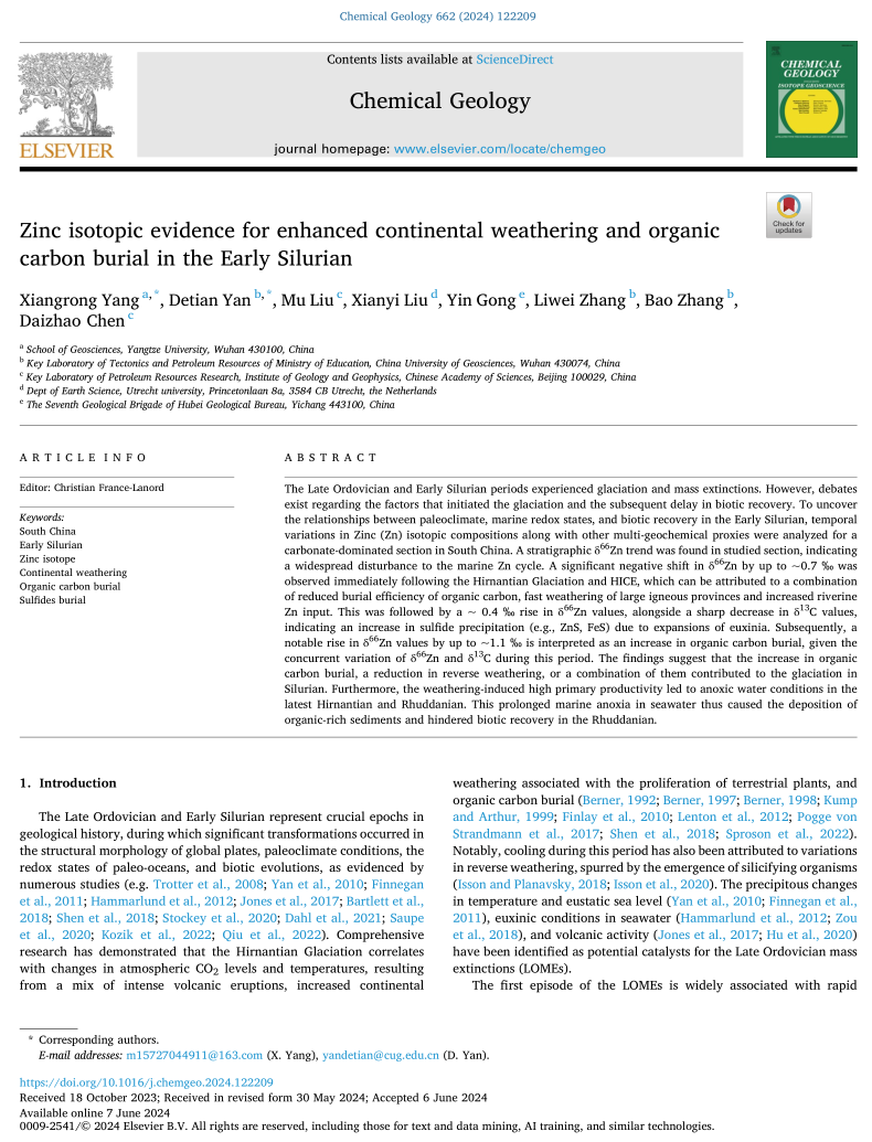 伟德国际1949官网地质系教师杨向荣在地学TOP期刊《Chemical Geology》上发表题为“Zinc isotopic evidence for enhanced continental weathering and organic carbon burial in the Early Silurian”的研究论文。