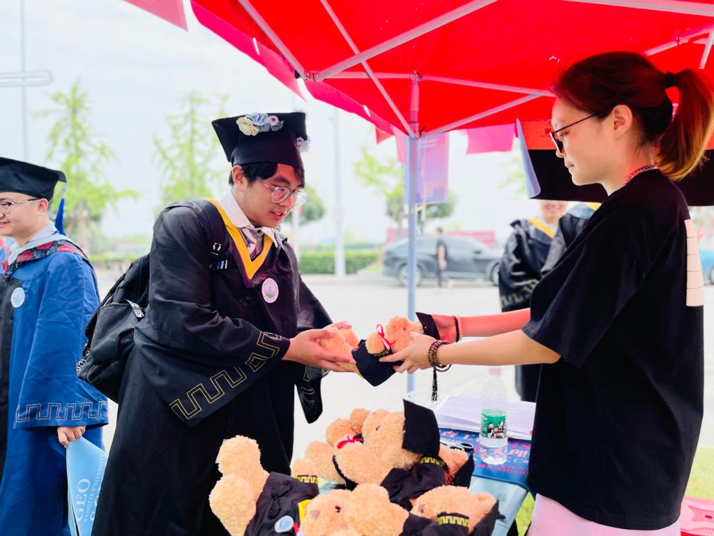 会场外,学院精心组织毕业生感恩礼活动,同学们填写问卷,写下对母校的美好祝愿和深情感谢,一个个身着学士袍的小熊玩偶、一张张公司员工原创设计的鼠标垫、印有学院元素的帆布包,寄托着学院对毕业生“前程似锦,一路生花”的殷切期盼。