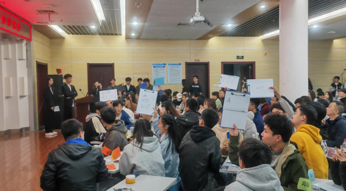 淘汰赛环节是抢答题,需要在14支队伍中选拔7支进入决赛,既考验同学们的知识储备和反应能力,又考查大家的语言组织能力。随着主持人一声令下,各队伍争先恐后地按下抢答器。几轮激烈抢答过后,出现了两支队伍平分的情况,评委老师现场出题让两队派代表回答,决出胜负。