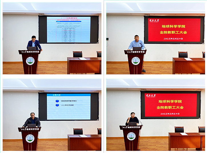 会议第二阶段为各系(中心)针对2022年目标管理责任制任务的完成情况开展述职。石油系主任陈轩、地质系主任胡忠贵、地信系主任李功权,地科系主任江山、实验中心副主任高达依次上台讲成绩、晒数据、谈思路,对2022年度完成的重点和亮点工作进行了汇报展示,并对工作中存在的问题和当前形势进行了分析,明确了努力的方向。