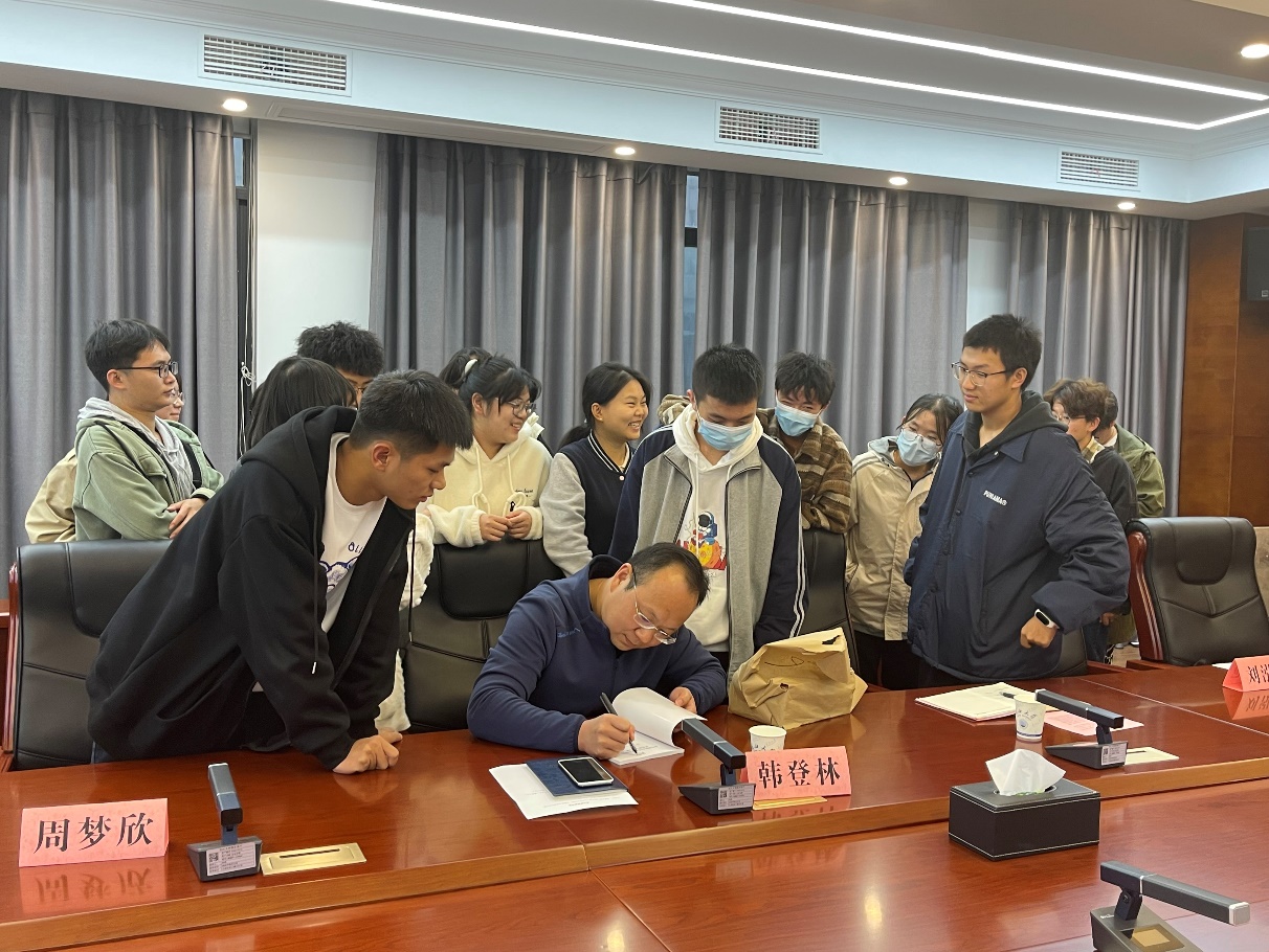 座谈结束后,韩登林教授向在座的同学每人赠送了一本由他及他的科研团队编著的专著《库车拗陷白垩系砂岩储层成岩动力学分析》。