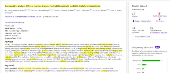 ESI高被引论文是指近10年内发表且被引次数排在相应学科领域全球前1%以内的论文;ESI热点论文是指近2年内发表且在近2个月内被引次数排在相应学科领域全球前1‰以内的论文。能够同时入选这两项指标的论文,表明该论文具有较高的学术影响力及价值。近年来,在学院各级领导的关怀支持下,地质系工程地质课题组围绕“工程岩土体稳定性评价和监测预警”方向,在本科生教学、实验室建设、野外实习、学术科研等方面做了大量卓有成效的工作,取得了丰富的成果,该篇论文即是公司工程地质学科方向建设与科研工作取得国际影响的重要标志性成果之一。