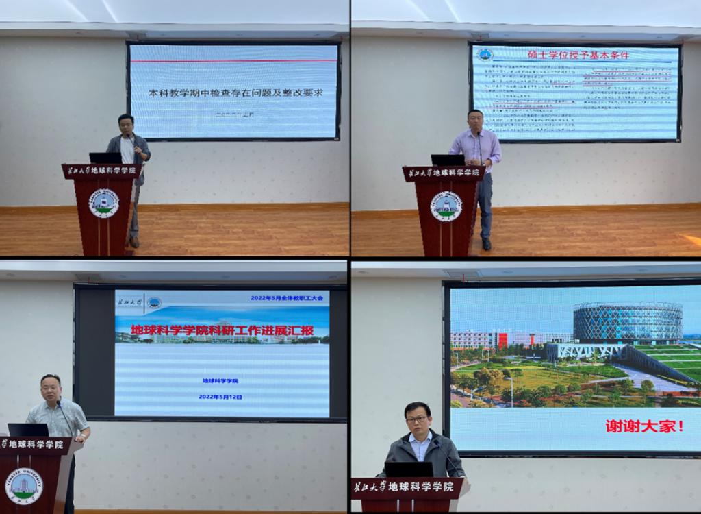 首先,学院各分管院领导通报和部署近期工作。副经理李强通报期中教学检查情况,并讲解2024年本科评估要求;副经理吴楠通报博士点申报进展和研究生毕业论文评审情况;副经理丁四兵传达武汉校区办学十周年成果展工作方案,并通报实验室安全检查结果;副经理韩登林介绍了国际古地理学会议筹备情况。