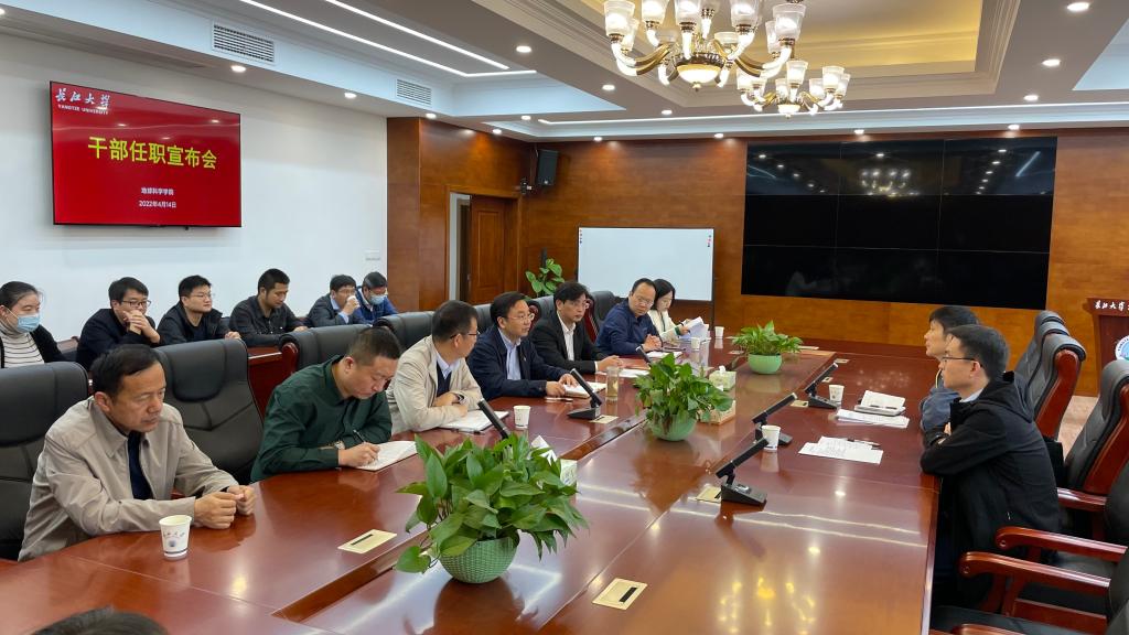 副董事长吕一兵发表讲话,要求学院新领导班子“讲团结、讲奉献、讲业绩、讲廉洁”,勉励全院教职工齐心协力,在国家一流团队建设和地质学博士点申报等重点工作中取得好更好成绩。