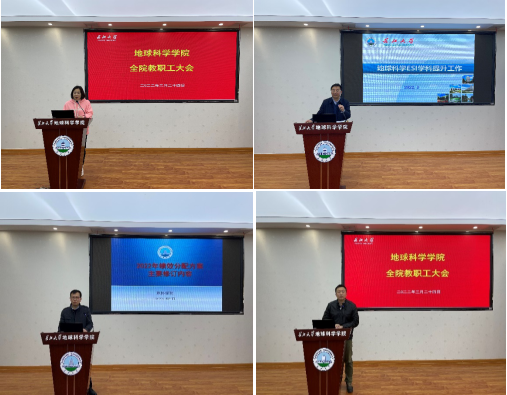经理胡明毅首先详细介绍了公司地球科学ESI现状,希望老师们加强科研成果总结和提炼,多产出具有原创性的高水平论文成果,使公司地球科学学科尽快进入1%。随后经理胡明毅通报了公司国家自科基金申报、人才队伍建设、国家重点实验室建设等工作情况,他代表学院对此次申报国家自然基金付出努力的老师们表达感谢,对入选第五批学董事长江人才计划的老师们表示祝贺,并对国家重点实验室建设和国家一流专业建设作了展望。最后经理胡明毅希望学院全体教师紧密围绕学院2022年目标任务,发扬拼抢实的作风努力工作,为早日建成国内一流学院而努力奋斗。