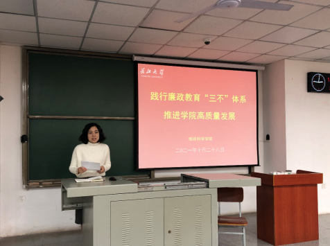 最后,党委副书记任倩为与会教职工上了一堂生动的党风廉政教育党课。党课围绕“党风廉政建设‘三不’体系”为主题,从统筹联动,科学有效地防治腐败和践行“三不”标准,筑牢廉洁防线两个方面深入展开。任倩指出,为促进“三不”的有机结合,要着眼“不敢”,强化政治监督;要聚焦“不能”,注重建章立制;要立足“不想”,激发担当意识。同时,要以上率下,践行“三不”标准,提升廉政教育领导力,强化广大党员干部法纪和规矩意识,为学院的发展,营造风清气正的良好校园风尚。任倩号召各系、机关各科室要将党风廉政、意识形态、师德师风三项建设统筹起来,抓好责任落实,明确发展目标,制定具体工作举措,全面提升本科及研究生教学质量,大力推进科学研究何实验室平台建设,加强团队队伍建设,从而有力推进学院高质量发展。