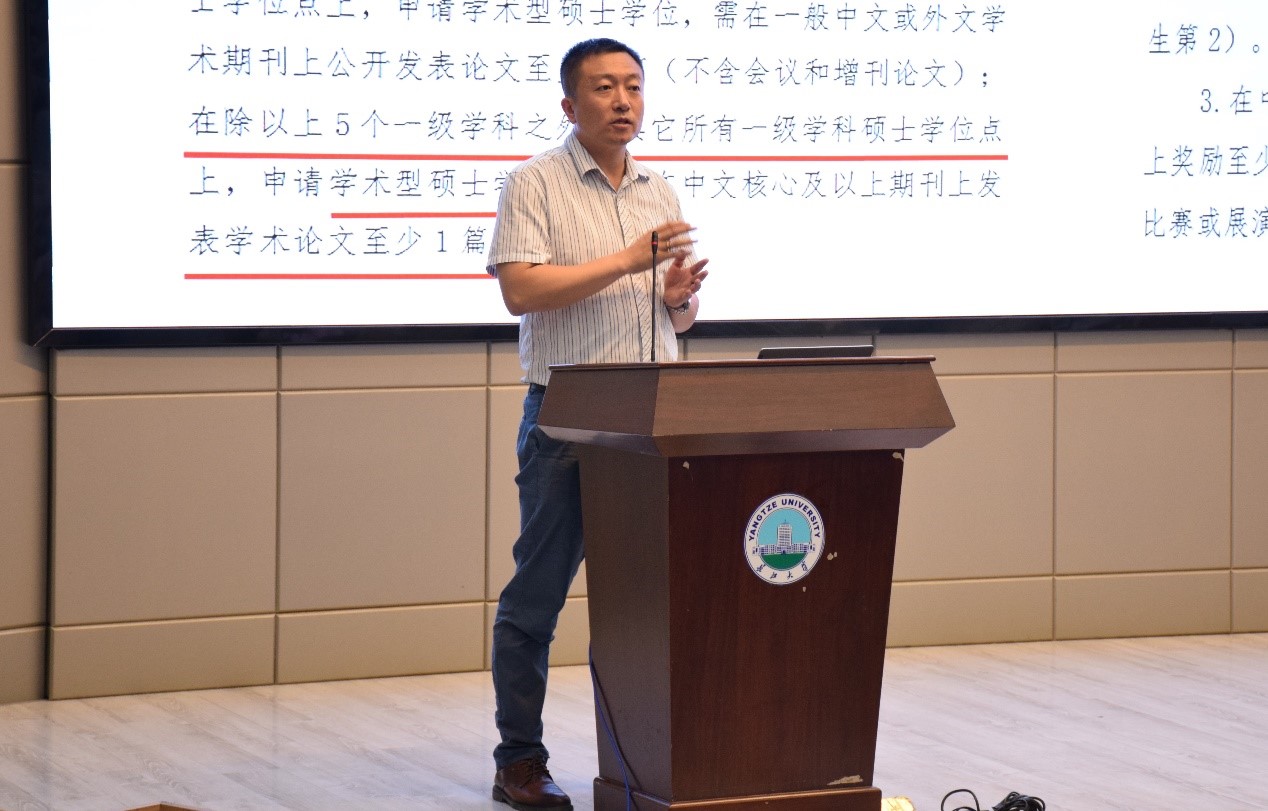 “学院会如何培养大家呢?大家现在毕业需要什么要求呢?学院的奖学金政策是什么样的?下面,我给大家一一解答。”副经理吴楠上台讲道。关于培养流程,他介绍了学制、培养计划、补修课程、中期考核、毕业答辩等方面的内容。关于毕业要求,他详细介绍了不同情况的同学必须达到的论文发表的级别和数目。关于毕业论文的外审要求,他提醒大家,一定要好好学习,写好毕业论文,外审的要求只会越来越严格,希望同学们能按照规定执行,努力使自己成为德才兼备的黄金一代。