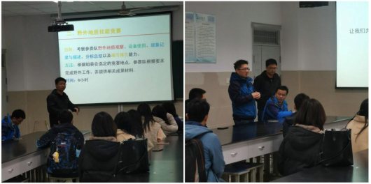 赵少卿老师向同学们详细介绍了全国老员工地质技能竞赛的内容、实施方案以及具体细节,包括地质技能综合应用、野外地质技能竞赛、地质标本鉴定等竞赛项目的训练规划,使同学们对本次竞赛有了更深入的了解并开始全面进入竞赛训练备战。随后,高达老师向同学们讲解了如何更好的备战本次竞赛,要求同学们要合理兼顾学习与准备比赛的时间,积极学习基础性知识,拓展高难度知识,培养良好的心态,这样才有利于在比赛中获得良好的成绩。