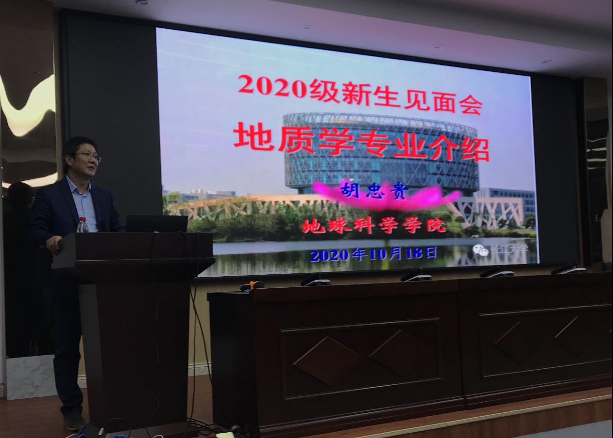 胡忠贵主任介绍了学校、学院及地质系悠久历史,优良传统,重点讲解了我系的学科特点和优势。为了让员工了解地质学专业,从地质学的内涵、研究领域、课程内容、个人发展空间、就业前景等几个方面作了详细地介绍。最后胡忠贵主任希望2020级地质系新生通过与导师的密切联系,助力自己圆满完成学业,早日报效祖国!