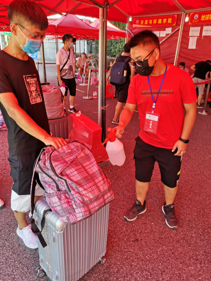 烈日炎炎,犹如同学们对校园的热情不减。到校同学们在校门前往指定地点有序排队,彼此间隔一米,学院辅导员老师和员工志愿者们进行体温测量、行李消毒、信息核实、检验健康码等工作,一切都在有条不紊的进行着。合格的同学在工作人员引导下,按要求走专用通道返回了宿舍。