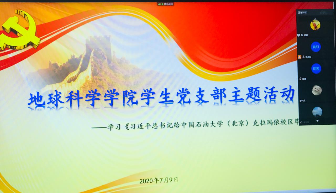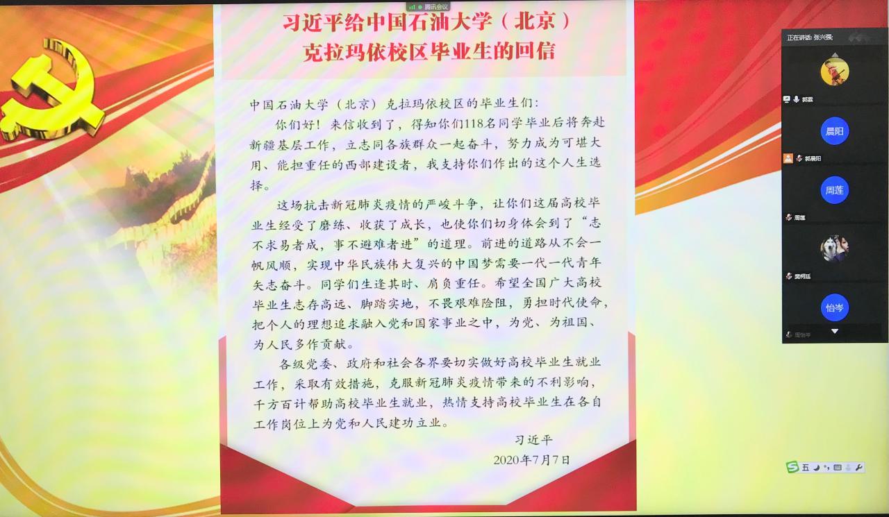 随后,不少党员同志结合工作与学习实际畅谈了自己的感想。毕业生党员张兴强说:“习近平总书记的回信不仅是针对中国石油大学(北京)克拉玛依校区毕业生的,更是对全国高校员工的谆谆教导。我正在中海油天津分公司接收入职培训,今后工作一定会牢记总书记的嘱托,脚踏实地、艰苦奋斗,为祖国的能源安全贡献全部力量。”新发展的预备党员刘威同学说:“2020年是不平凡的一年,从抗‘疫’到抗‘洪’,切实感受到习近平总书记所说的‘生逢其时、肩负重任’,我会时刻以党员的标准要求自己,冲锋在前,勇担使命。” 郭霖老师结合今年本院毕业生就业及升学情况,对大家的发言进行了总结,希望大家今后能继续用自己的实际行动,践行初心和使命,为实现中国梦奉献智慧和力量。