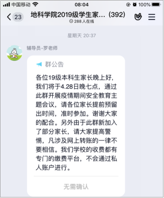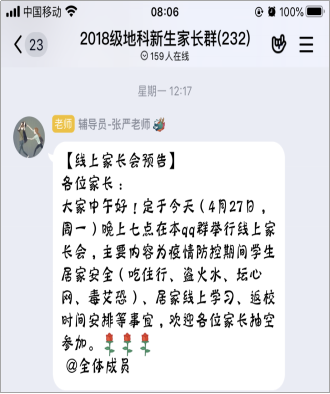 为保障此次线上安全教育专题会议顺利、有效开展,公司学工办全体老师前期做了充分准备。一是4月24日在网上进行了集体讨论与筹划,确定了专题会议的开展形式、主要内容、具体安排等;二是抓住疫情期间员工居家学习教育管理的重难点,制作专题会议PPT;三是以“家庭责任与学会沟通”为主题,拟定防疫期间员工居家学习温馨提示,及安全责任告知书;四是各年级辅导员将专题会议安排及要求发布给员工及家长;五是利用辅导猫及短信平台向员工及家长推送关注员工心理健康短信。