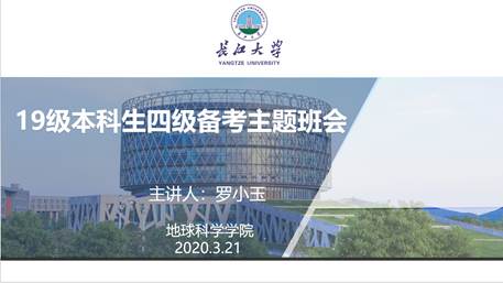 (通讯员 王铃淇)3月21日19点,地科学院全体19级本科生及其家长早早守候在电脑、手机前,参加由19级年级辅导员罗小玉老师召开的四级备考线上主题班会。据悉,参加本次主题班会的还有地科学院任倩副书记、学工办全体辅导员老师及19级本科生部分班主任。
