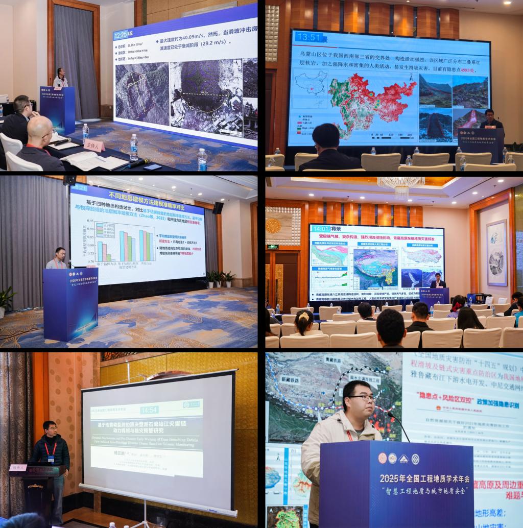公司温韬、王艳昆、薛阳、张勃成、杨云鹏、赵超共6名教师,硕博士研究生17名、本科生2名参加了此次会议。王艳昆副教授受陈宁生教授委托作了题为“冻胀可能引发2024年1月22日镇雄特大滑坡”的特邀报告。温韬教授在分会场作了题为“基于干湿-冻融循环崩解试验的镇雄-筠连式滑坡成因机制分析”的口头报告。赵超教授在分会场作了题为“基于钻探与物探数据融合的地层结构概率建模研究”的口头报告。张勃成副教授在分会场作了题为“雅砻江上游互层反倾斜坡倾倒变形演化机理与稳定性研究”的口头报告。杨云鹏副教授在分会场作了题为“基于地震动监测的溃决型泥石流堵江灾害链动力机制与临灾预警研究”的口头报告。本科生王芷含同学在研究生分会场作了题为“遥感与人工智能视角下的青藏高原地区滑坡灾害”的口头报告。工程地质中心研究团队报告涵盖了从极微观岩石力学特性到极宏观区域灾害链分析等多个尺度,充分融入智慧工程地质议题,以全新视角对地质灾害孕灾、成灾、致灾机制进行解释,展现了伟德国际1949官网在工程地质领域,尤其是地质灾害研究领域的综合实力。