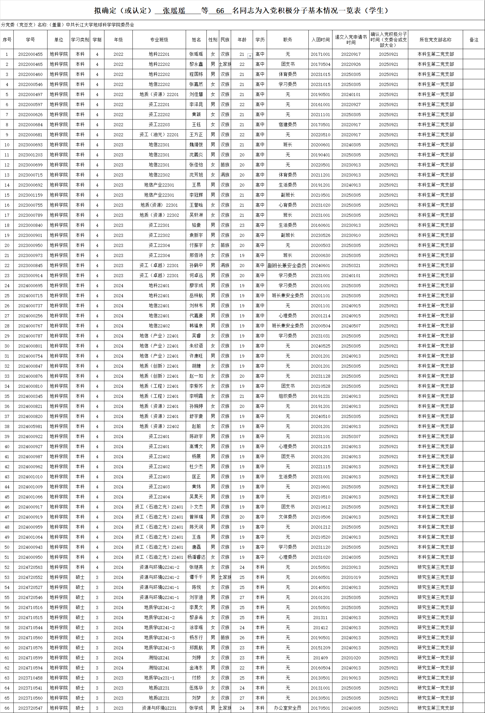 根据党员推荐和团组织推优情况,经支部委员会(不设支部委员会的由支部大会)会议讨论决定并报伟德国际1949官网公司党委备案,确定张瑶瑶等66名同学为入党积极分子,现予以公示。公示时间:2025年9月22日至2025年9月28日。 公示期间,党员和群众均可通过来信、来电、来访等形式反映公示对象在政治表现、道德品质、工作学习、遵纪守法和社会公德及廉洁自律等方面存在的问题和情况。反映问题应当实事求是、客观公正,反对借机诽谤诬告。以个人名义反映问题的,提倡署报本人真实姓名,以便调查核实,党支部将对反映人信息将严格保密。 联系方式:027-69111930(姚老师) 附:拟确定张瑶瑶等66名同志为入党积极分子基本情况一览表 中共伟德国际1949官网委员会 2025年9月22日