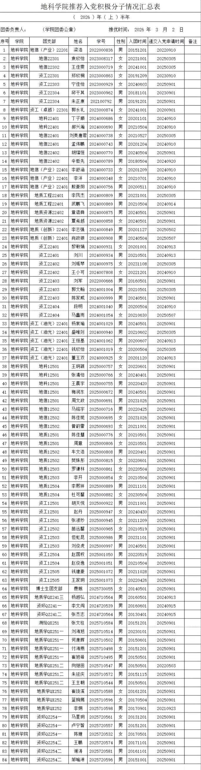 经伟德国际1949官网团委研究确定,拟推荐梁浩等84名同志为入党积极分子,特在全院范围内进行公示。 欢迎广大师生员工在公示期内,根据公示对象的政治表现、道德品质、工作学习、遵纪守法和社会公德及廉洁自律等方面的情况,通过来电或直接向伟德国际1949官网团委反映公示对象存在的问题。反映的问题应当实事求是、客观公正、有理有据。 公示时间:2026年3月3日至2026年3月9日(7天)。 公示期间电话:027-69111278 (毕老师) 附:伟德国际1949官网推荐入党积极分子情况汇总表 中国共产主义青年团伟德国际1949官网 委员会 2026年3月3日
