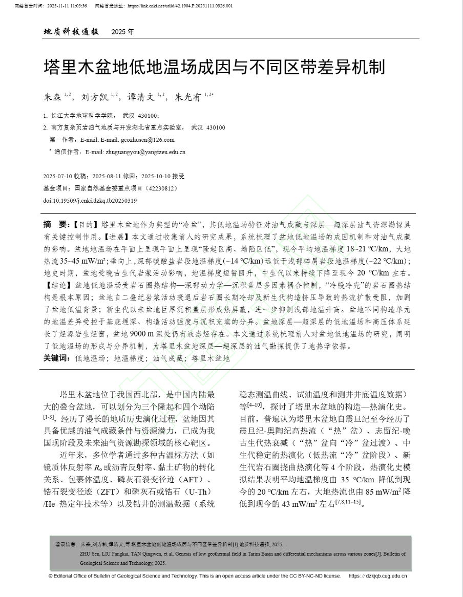 论文系统梳理了塔里木盆地低地温场的空间分布特征、成因机制及其对深层—超深层油气成藏的控制作用,为盆地深层油气勘探提供了重要的地热学依据。