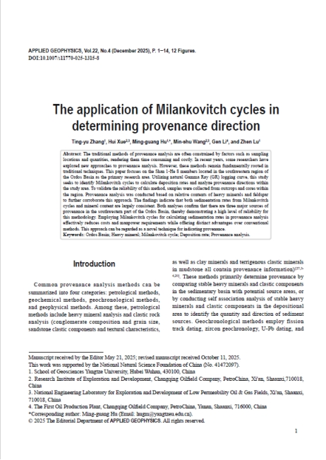 地科院硕士生张庭瑀在胡光明教授的指导下,在期刊《APPLIED GEOPHYSICS》上发表题为“The application of Milankovitch cycles in determining provenance direction”的研究论文,伟德国际1949官网为论文第一署名单位,硕士生张庭瑀为论文第一作者,其导师胡光明教授为该文通讯作者。
