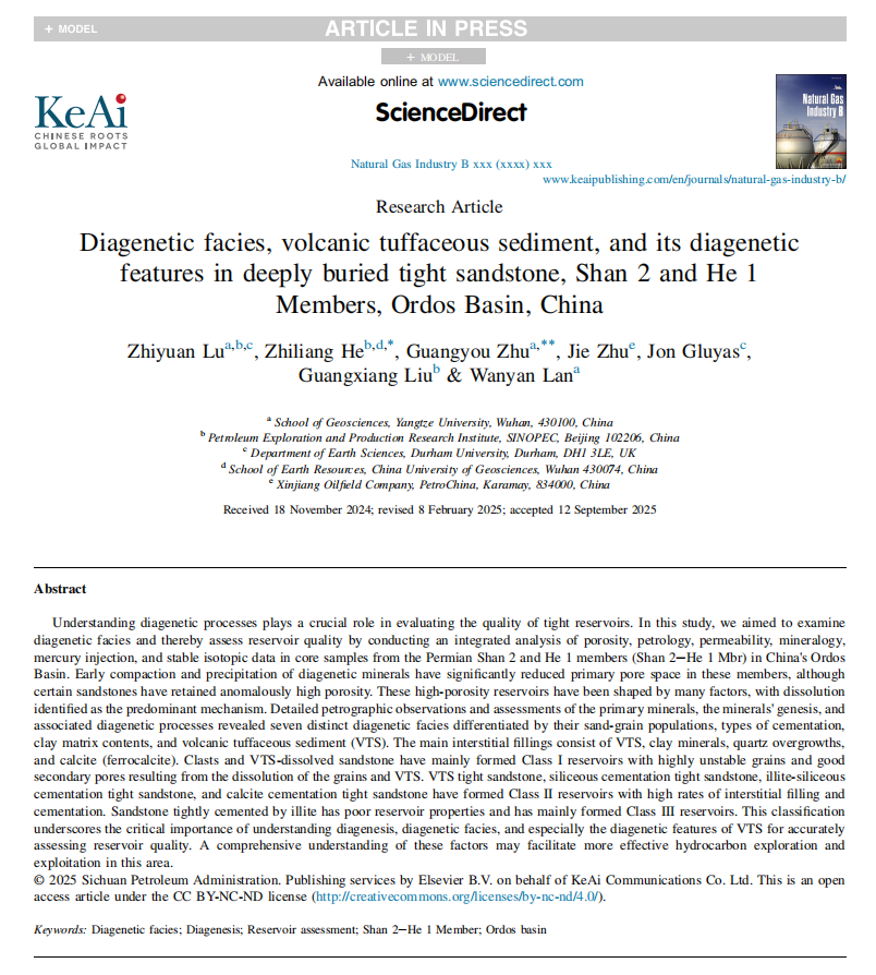 鄂尔多斯盆地是中国重要的致密气产区,上古生界山2段与盒1段是该区最主要的致密砂岩气储层。尽管早期压实和成岩矿物的沉淀显著降低了原生孔隙,部分砂岩仍保留了异常高孔隙度。为深入评价储层质量,来自伟德国际1949官网深层与非常规团队、中国石化石油勘探开发研究院及杜伦大学等机构的联合研究团队,围绕山2-盒1段致密砂岩的成岩相类型、火山凝灰质沉积(VTS)及其成岩特征展开系统研究,在Natural Gas Industry B(主编:邹才能院士,张金川教授,中科院工程技术大类2区、能源与燃料小类2区)发表Diagenetic Facies, Volcanic Tuffaceous Sediment, and Its Diagenetic Features in Deeply Buried Tight Sandstone, Shan 2 and He 1 Members, Ordos Basin, China(鄂尔多斯盆地山2段-盒1段深埋致密砂岩成岩相、火山凝灰质沉积物及其成岩特征),旨在揭示其对储层物性的控制机制,为该区致密气高效勘探与开发提供理论依据。