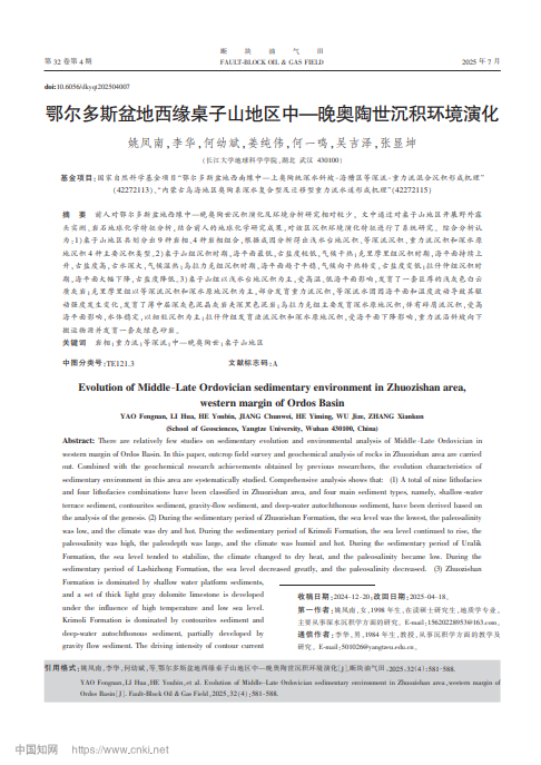 论文信息:姚凤南,李华,何幼斌,等.鄂尔多斯盆地西缘桌子山地区中—晚奥陶世沉积环境演化[J].断块油气田,2025,32(04):581-588.