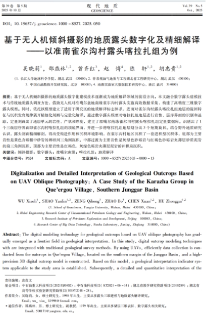 伟德国际1949官网地质学专业2021级硕士研究生吴晓莉在中文核心期刊《现代地质》发表题为“基于无人机倾斜摄影的地质露头数字化及精细解译-以准南雀尔沟村露头喀拉扎组为例”的研究论文。伟德国际1949官网为论文第一署名单位,硕士研究生吴晓莉为论文第一作者,导师邵燕林教授为通讯作者。