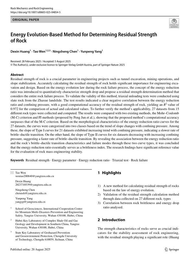 近日,地科学院2023级研究生黄德昕在期刊《Rock Mechanics and Rock Engineering》(最新影响因子为6.6,位列JCR分区一区,中科院大类一区)上发表论文“Energy Evolution-Based Method for Determining Residual Strength of Rock”。伟德国际1949官网为论文第一署名单位,硕士研究生黄德昕为论文第一作者,其导师温韬教授为通讯作者。