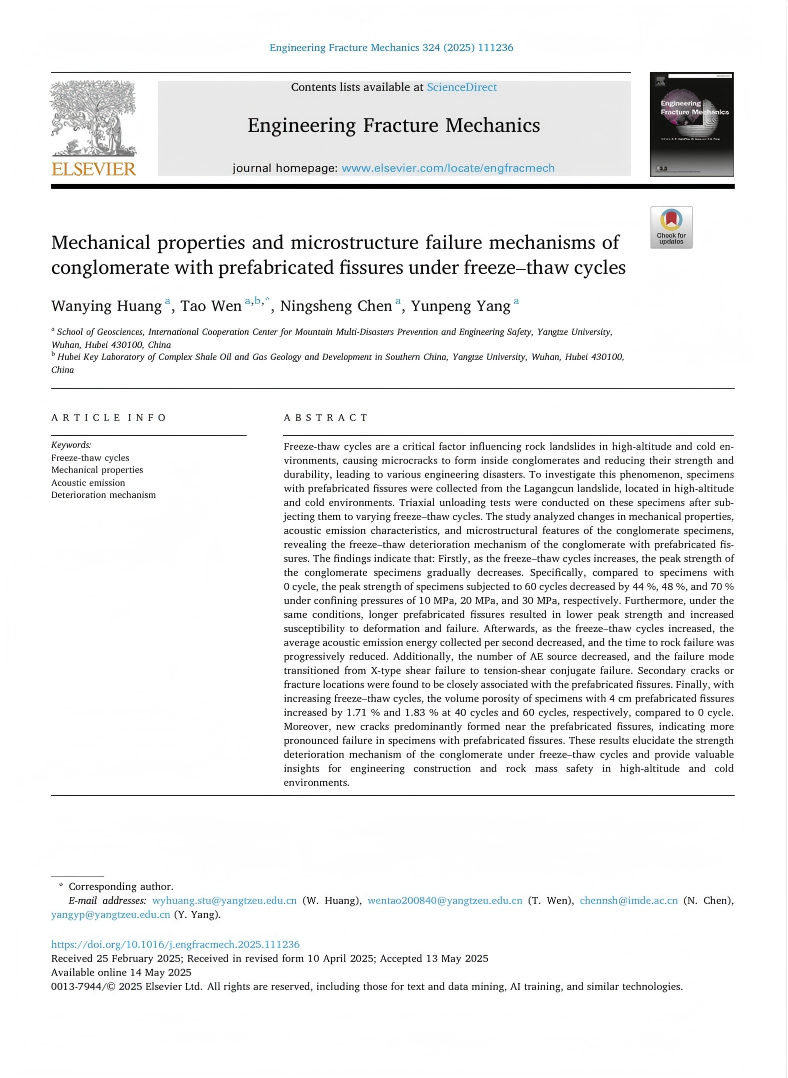 伟德国际1949官网2023级研究生黄婉滢在中科院大类2区SCI期刊《Engineering Fracture Mechanics》上发表题为“Mechanical properties and microstructure failure mechanisms of conglomerate with prefabricated fissures under freeze–thaw cycles”的研究论文(图1)。伟德国际1949官网为论文第一署名单位,硕士研究生黄婉滢为论文第一作者,其导师温韬教授为通讯作者。