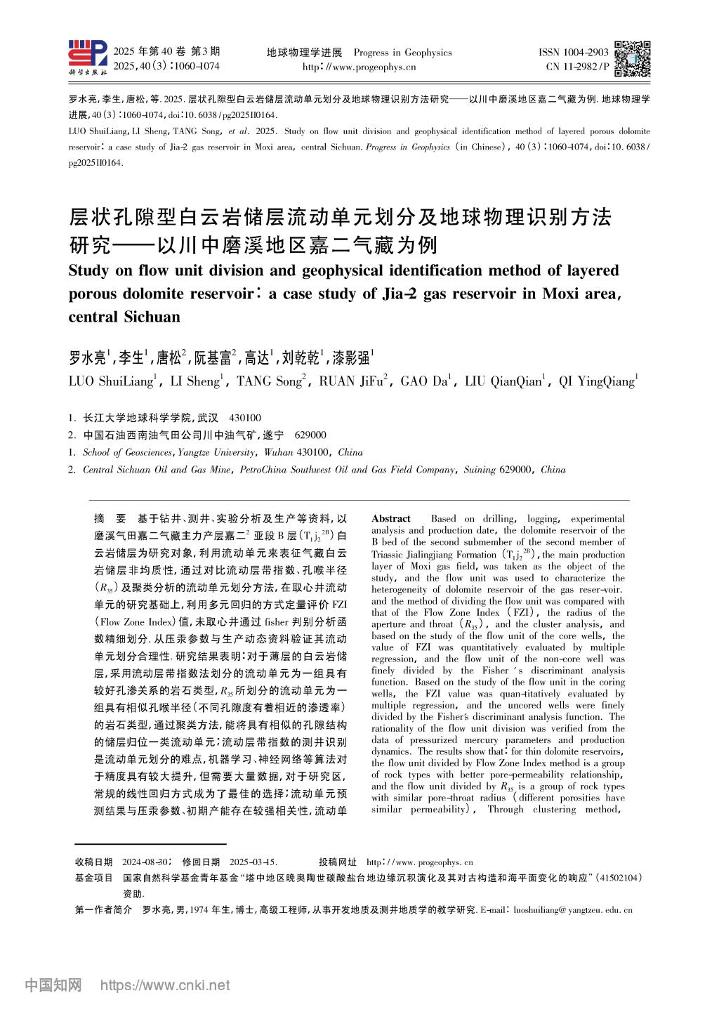 论文信息:罗水亮,李生,唐松,等. 2025.层状孔隙型白云岩储层流动单元划分及地球物理识别方法研究——以川中磨溪地区嘉二气藏为例.地球物理学进展, 40(3):1060-1074, doi:10. 6038/pg2025II0164.