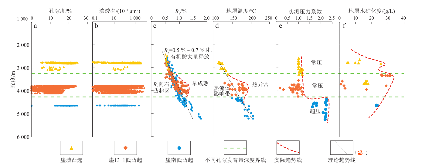 图1 不同构造带碎屑岩储层埋深与物性、温-压条件及地层水矿化度相关性特征