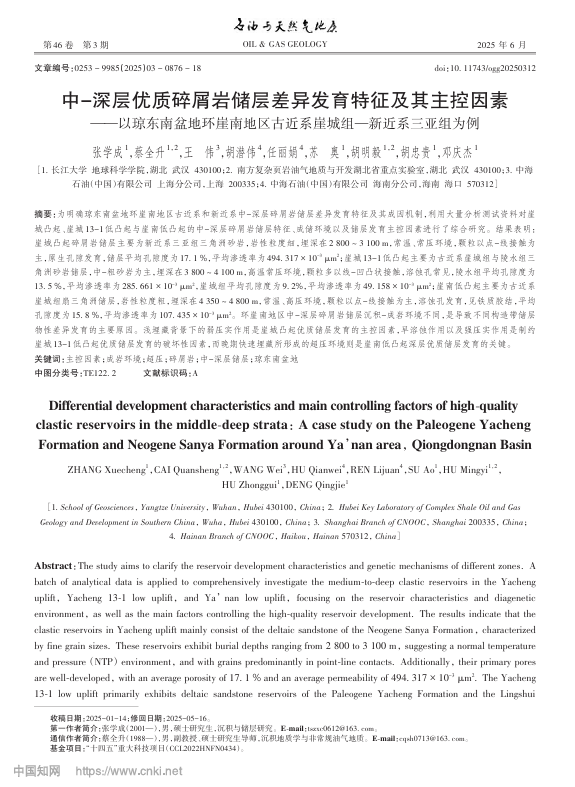 伟德国际1949官网23级研究生张学成以第一作者身份在中文EI检索期刊《石油与天然气地质》上发表了题为“中-深层优质碎屑岩储层差异发育特征及其主控因素——以琼东南盆地环崖南地区古近系崖城组—新近系三亚组为例”的研究论文,伟德国际1949官网为论文第一署名单位,其导师蔡全升副教授为论文通信作者。
