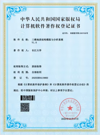 伟德国际1949官网硕士生吴栩璇开发的软件《三维地质结构模拟与分析系统》取得了软件著作权并进行成果转化。伟德国际1949官网为第一申请人,硕士研究生吴栩璇为第一发明人。