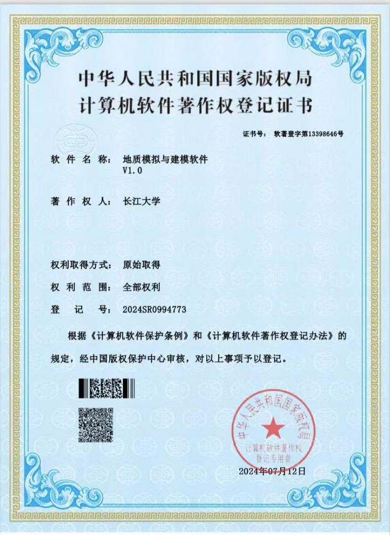 伟德国际1949官网硕士生汪嘉豪开发的软件《地质模拟与建模软件》取得了软件著作权并进行成果转化。伟德国际1949官网为第一申请人,硕士研究生汪嘉豪为第一发明人。
