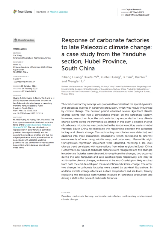 地科学院2022级研究生黄子航在海洋与淡水生物学国际2区SCI期刊《Frontiers in Marine Science》上发表题为“Response ofcarbonatefactories tolate Paleozoicclimatechange:acasestudy from the Yanduhe section, HubeiProvince, South China”的研究论文。伟德国际1949官网为论文第一署名单位,硕士研究生黄子航为论文第一作者,其导师易雪斐副教授为通讯作者。