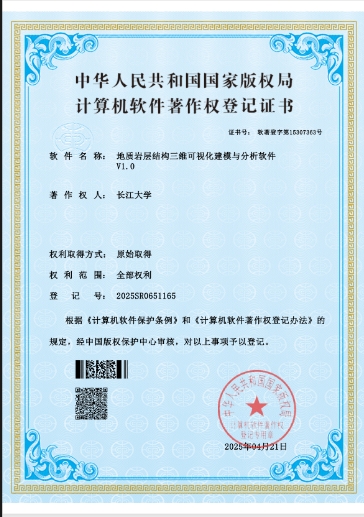 伟德国际1949官网硕士生严嘉成开发的软件《地质岩层结构三维可视化建模与分析软件》取得了软件著作权并进行成果转化。伟德国际1949官网为第一申请人,硕士研究生严嘉成为第一发明人。