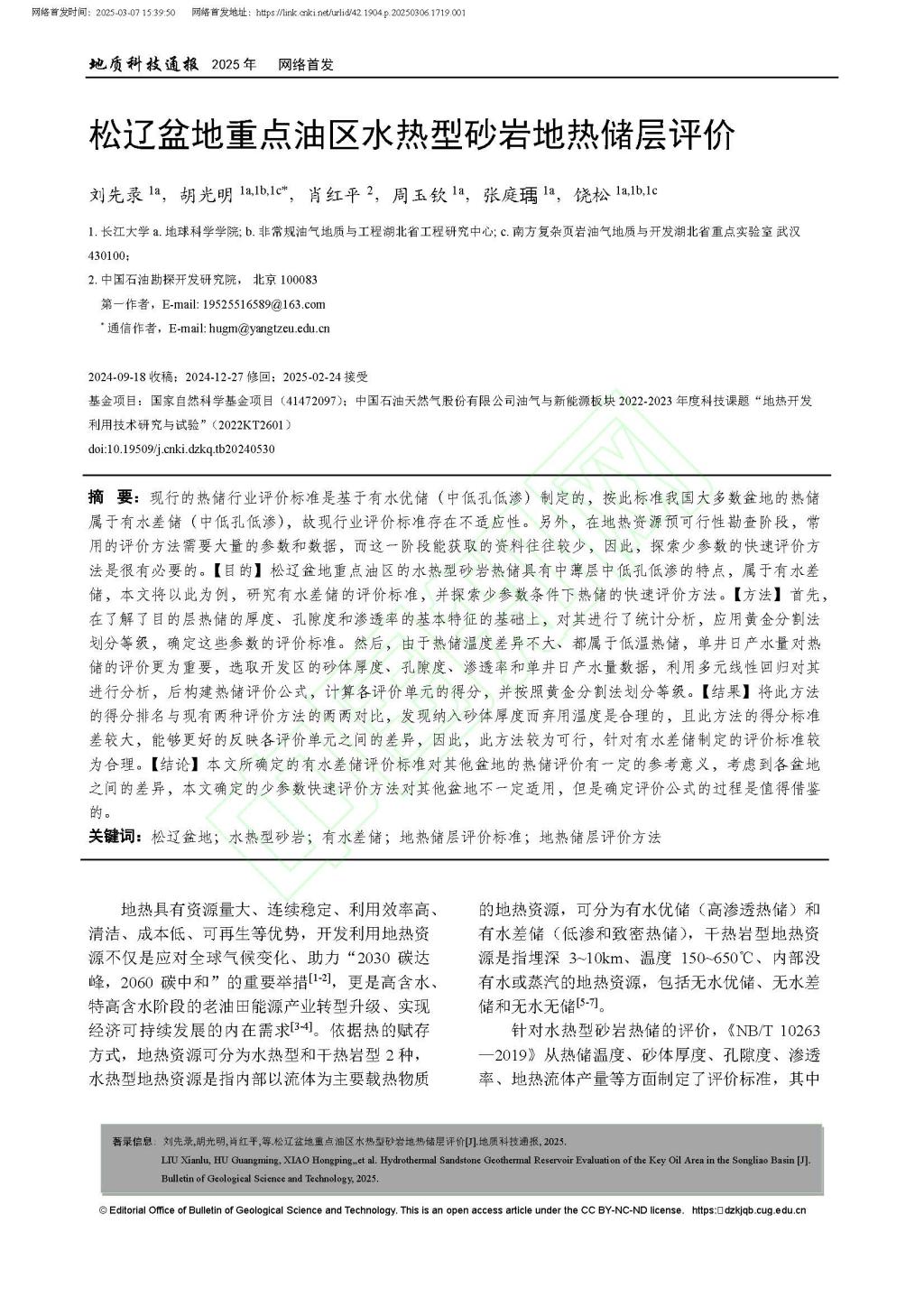 地科院硕士生刘先录在胡光明教授的指导下,在期刊《地质科技通报》上发表题为“松辽盆地重点油区水热型砂岩地热储层评价”的研究论文,伟德国际1949官网为论文第一署名单位,硕士生刘先录为论文第一作者,其导师胡光明教授为该文通讯作者。