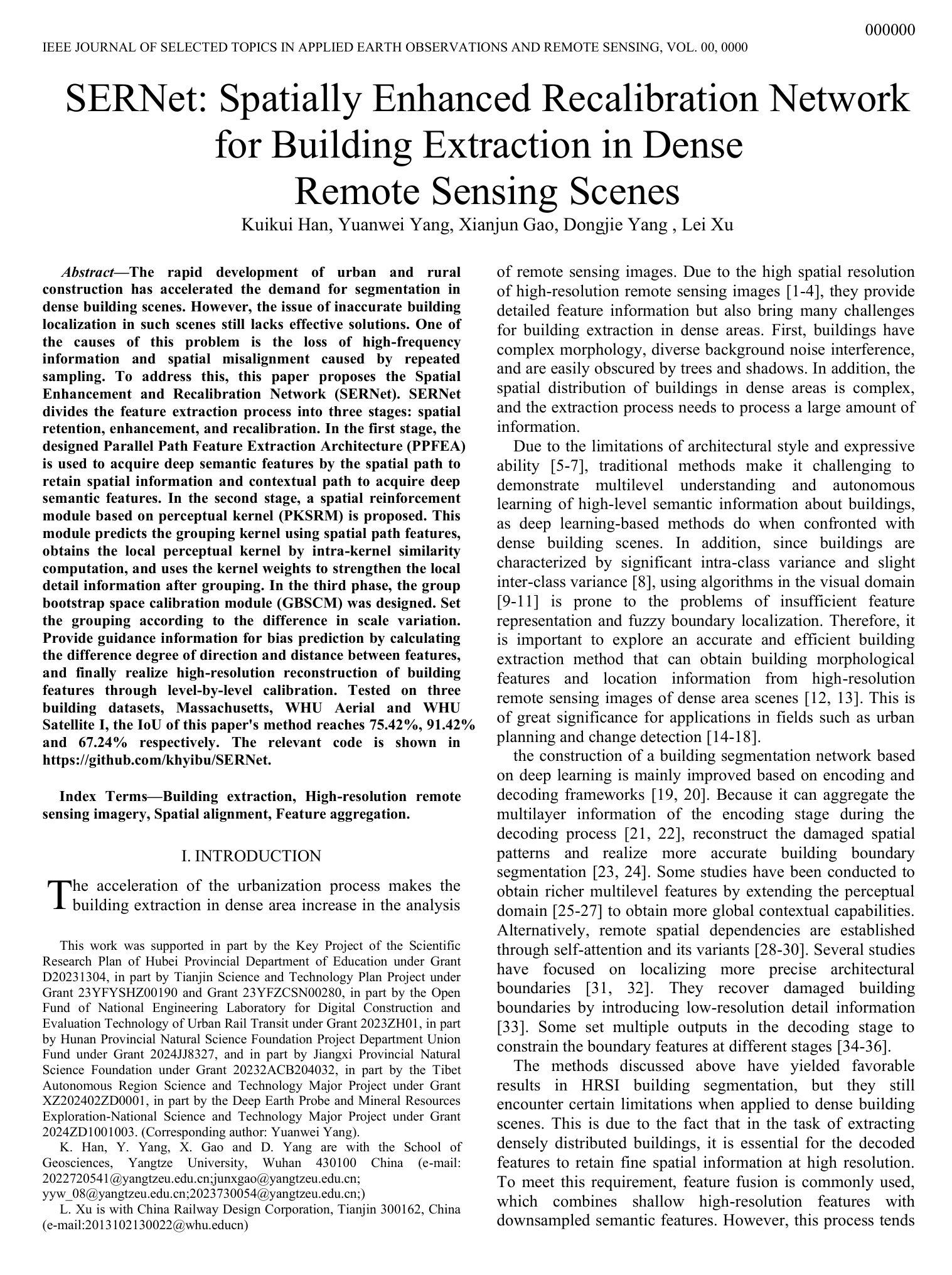 地科学院研究生韩奎奎以第一作者身份在SCI二区期刊《IEEE Journal of Selected Topics in Applied Earth Observations and Remote Sensing》上发表题为“SERNet: Spatially Enhanced Recalibration Network for Building Extraction in Dense Remote Sensing Scenes”的研究论文,其中伟德国际1949官网为论文第一署名单位,研究生韩奎奎为第一作者,副教授杨元维为论文通讯作者。